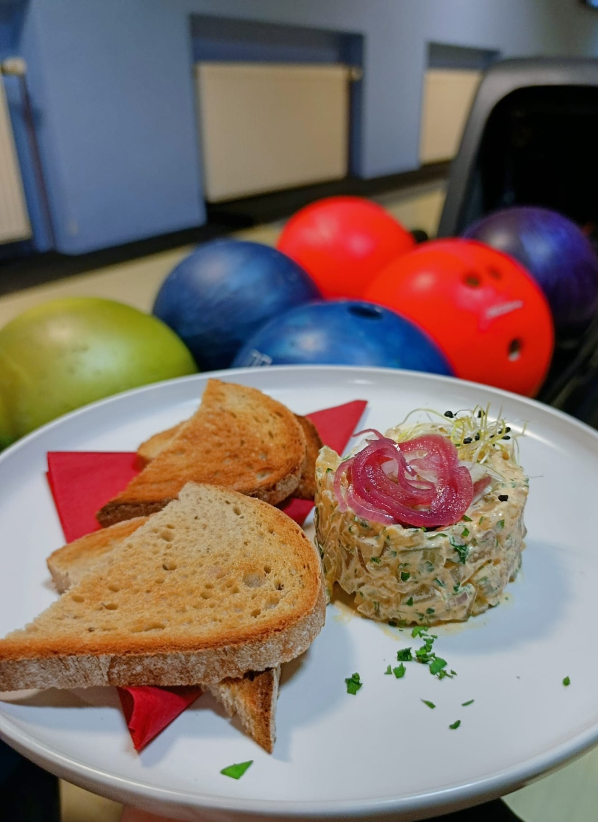 Pikantní tvarůžkový tataráček, s creme fraiche a šalotkou, opečený chléb nebo topinky Alergeny: 1a, 7, 10 |