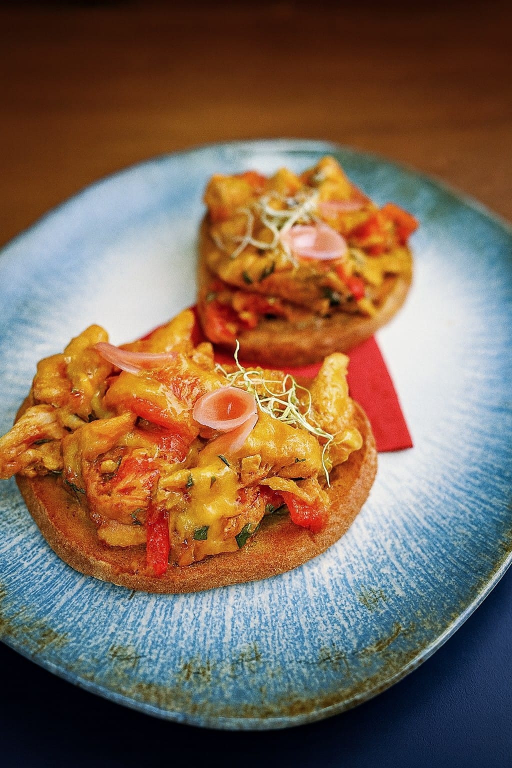Topinka Masová dekandence, topinková směs z kuřecího masa (100g) s pečenou paprikou, pošírovaný žloutek Alergeny: 1a, 3, 7, 9, 10 |